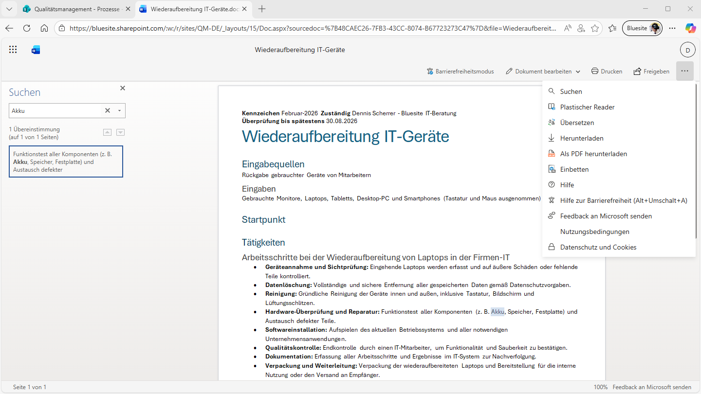 Microsoft 365 öffnet Dokumente automatisch im Lesemodus, wenn die Person das Dokument nur Lesen darf. Das gilt für alle Mitarbeitenden, die Websitebesucher der Qualitätsmanagement-Website sind. Der Word-Lesemodus bietet neben dem Anzeigen eine Volltextsuche, Sprachübersetzung, das Ausdrucken und Herunterladen.