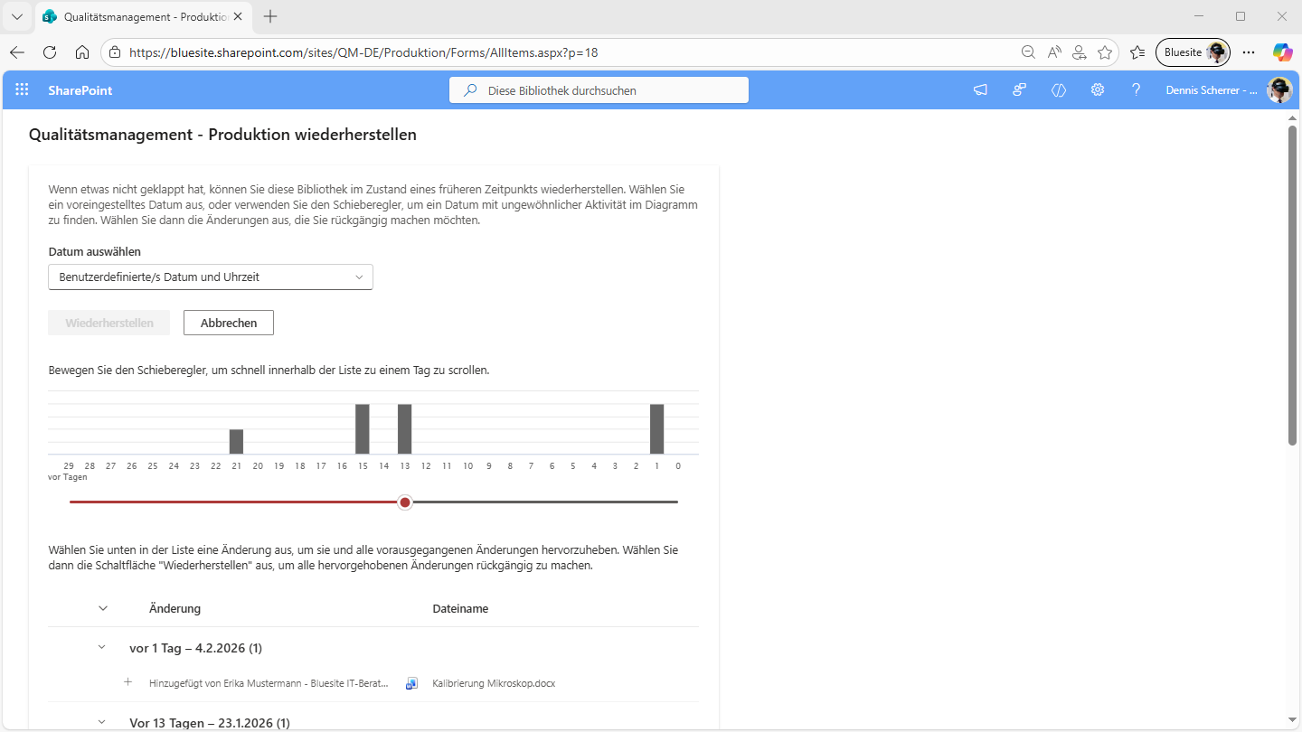 Die Bibliothek „Produktion“ oder „Dienstleistung“ einer SharePoint Qualitätsmanagement-Website von Bluesite IT-Beratung schickt bei Änderungen eine E-Mail an die zuständige Person. Das vorherige Dokument wird im Versionsverlauf gespeichert und im Laufe der Zeit automatisch gelöscht. Zu Änderungen an Arbeitsanweisungen (AA) oder Verfahrensanweisungen (VA) sind nur Mitglieder des Qualitätsmanagement-Teams berechtigt. Diese Qualitätsmanagementbeauftragten können die gesamte Bibliothek für die Produktion oder Dienstleistung wiederherstellen, indem sie Änderungen an den Dokumenten rückgängig machen.