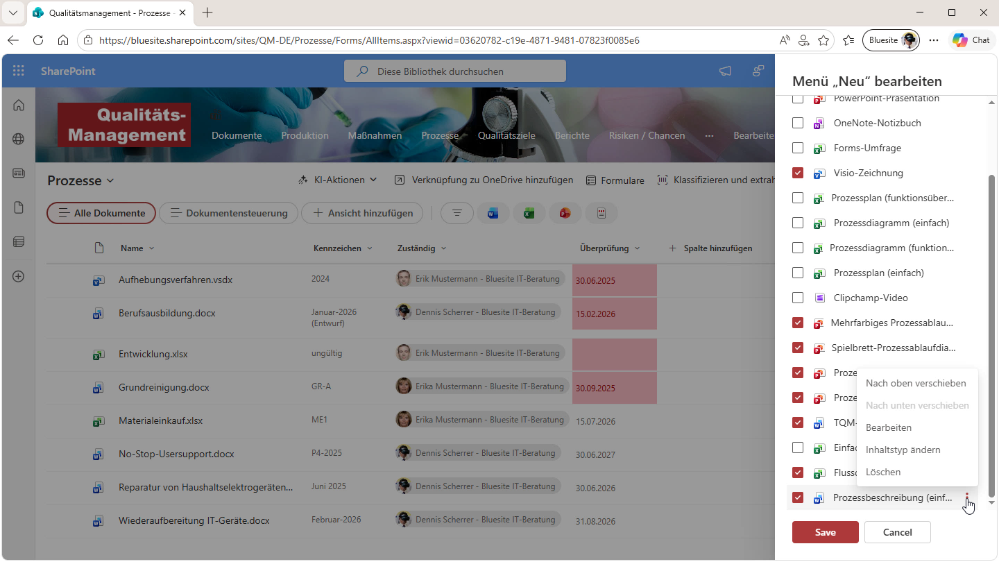 Der Dialog Menü „Neu“ bearbeiten, rechts am Rand, zeigt die Vorlagen die in der SharePoint-Bibliothek unter + Erstellen oder hochladen angezeigt werden (die Überschrift wurde beim Microsoft 365-Update der Benutzeroberfläche im Februar 2026 scheinbar übersehen, eine passendere Überschrift wäre Menü „Erstellen oder hochladen“ bearbeiten; die Schaltflächen Save und Cancel wurden nicht auf Deutsch übersetzt).