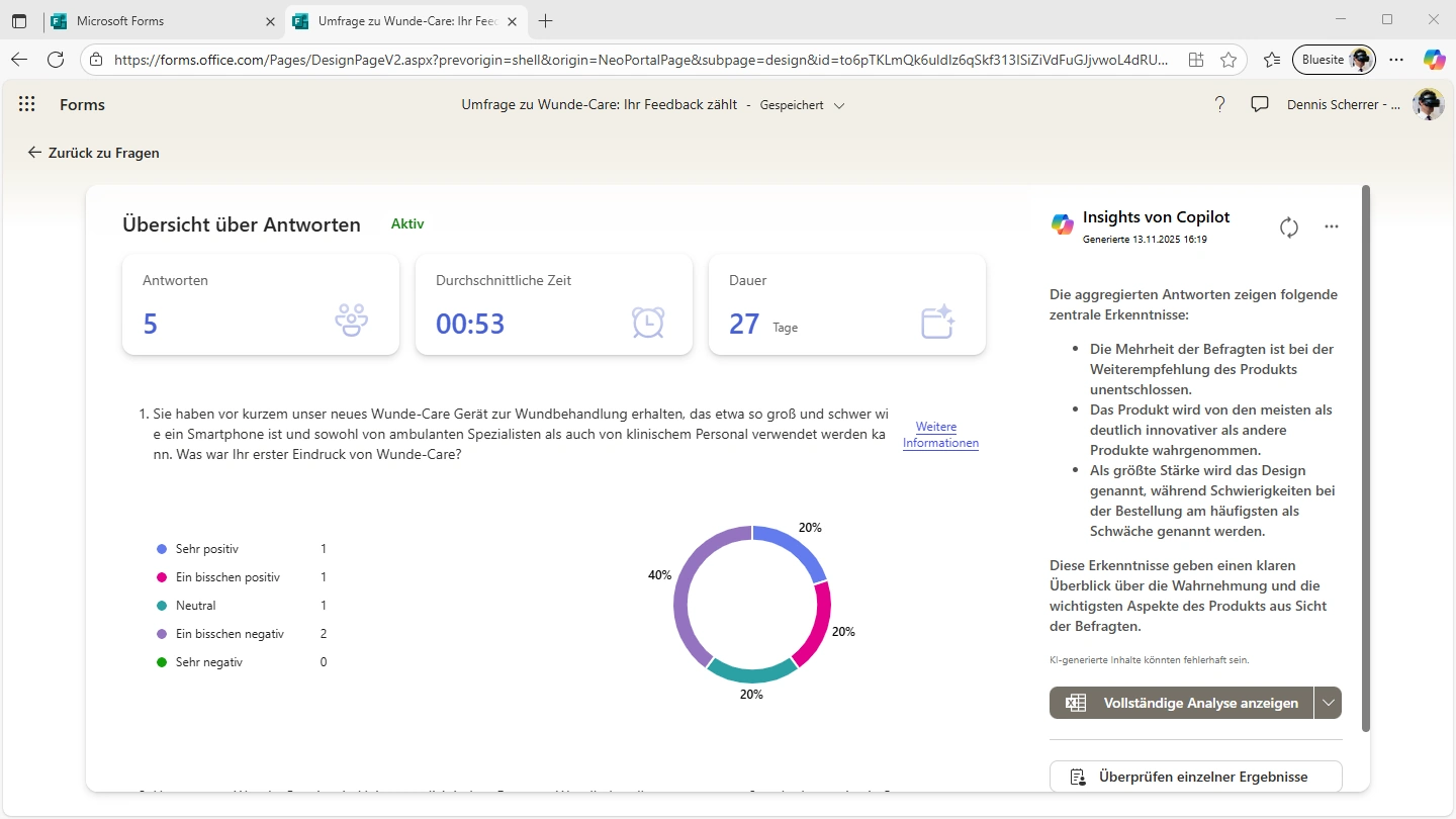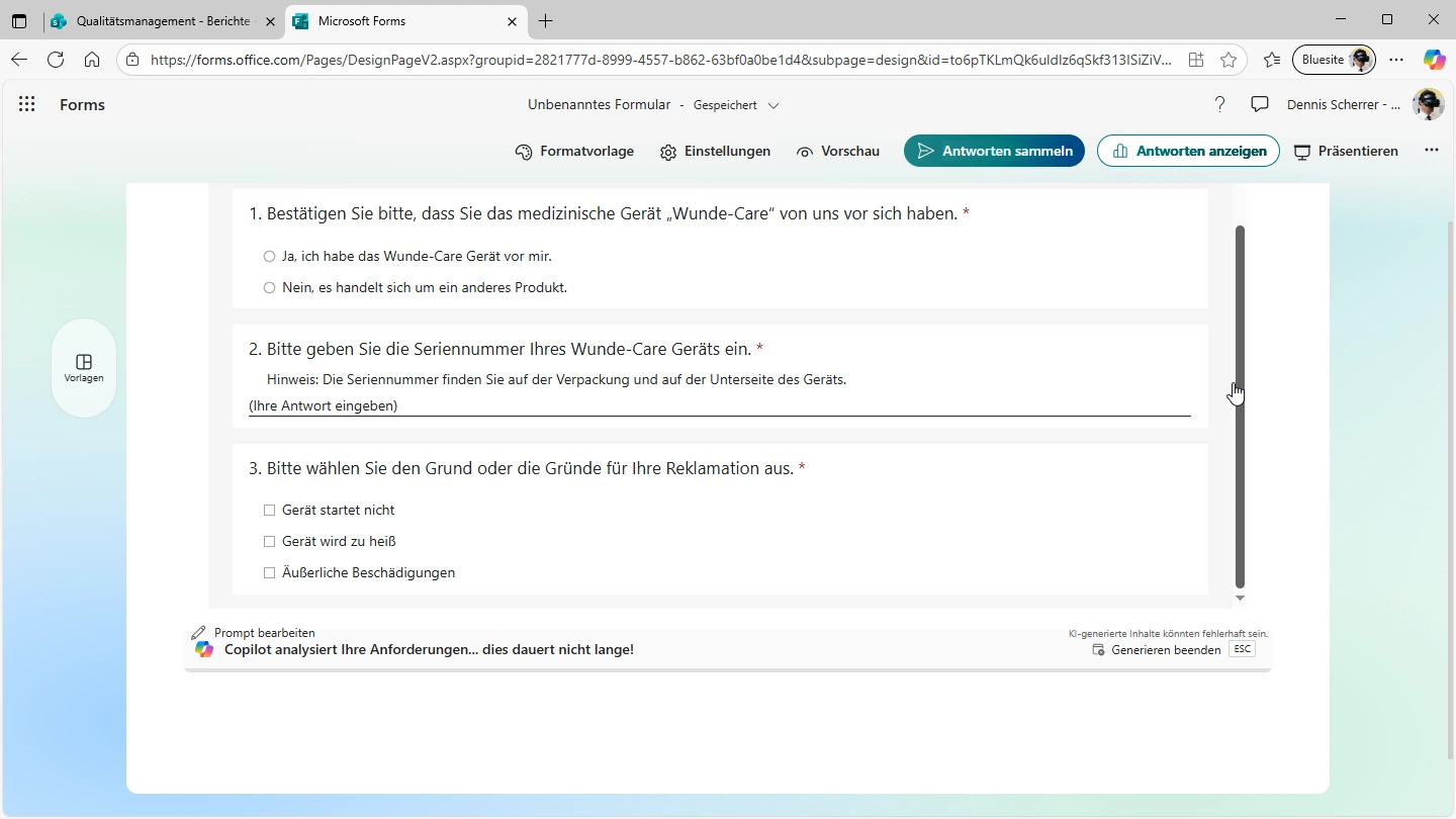 Kundenrückmeldungen bilden gemäß ISO 9001:2015 einen wesentlichen Bestandteil der Bewertung und Steigerung der Kundenzufriedenheit. Sie dienen dazu, die Konformität von Produkten und Dienstleistungen zu sichern, kontinuierliche Verbesserungsprozesse im Unternehmen zu unterstützen, Risiken sowie Chancen zu identifizieren und die Effektivität des Qualitätsmanagementsystems zu beurteilen und weiterzuentwickeln. Durch den Einsatz standardisierter Formulare können relevante Informationen strukturiert erfasst werden. Mit Microsoft Forms in Microsoft 365 lassen sich Online-Formulare effizient und ohne Programmierkenntnisse erstellen. Die Auswertung der Rückmeldungen kann anschließend mit Excel erfolgen und durch KI-generierte Zusammenfassungen unterstützt werden.