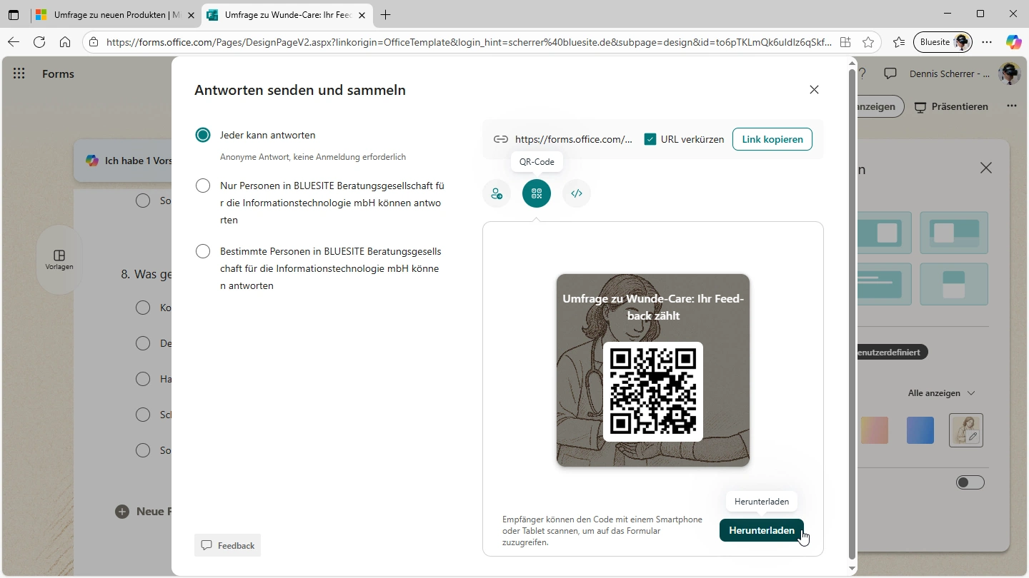 Ihre Kunden nehmen an der Umfrage unter eine bestimmten URL teil. Microsoft Forms kann die “URL verkürzen”. Eine kurze URL zur Umfrage ist einfacher zu versenden. Fügen Sie die kurze URL als Link in E-Mails oder Chat-Nachrichten ein. Laden Sie im Microsoft Forms den “QR-Code” zur Umfrage herunter und kleben Sie ihn auf Verpackungen. Empfänger können den Code mit einem Smartphone oder Tablet scannen, um auf das Formular zuzugreifen. Binden Sie Ihre Microsoft Forms-Umfragen in Ihre Webseite ein. So erhalten Sie noch mehr Rückmeldung.