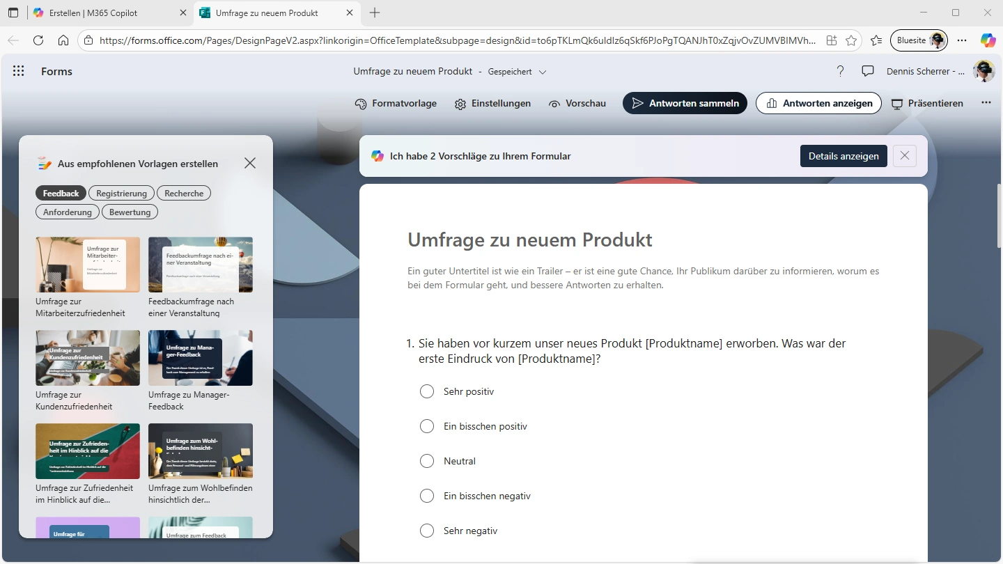 Wenn Sie beispielsweise Feedback Ihrer Kunden zu einem neuen, innovativen Produkt sammeln möchten, lassen Sie sich inspirieren von der Microsoft Forms-Vorlage “Umfrage zu neuen Produkten” unter “Erstellen” (englisch “Create”), “Formular” auf der “M365 Copilot”-Startseite (https://m365.cloud.microsoft).