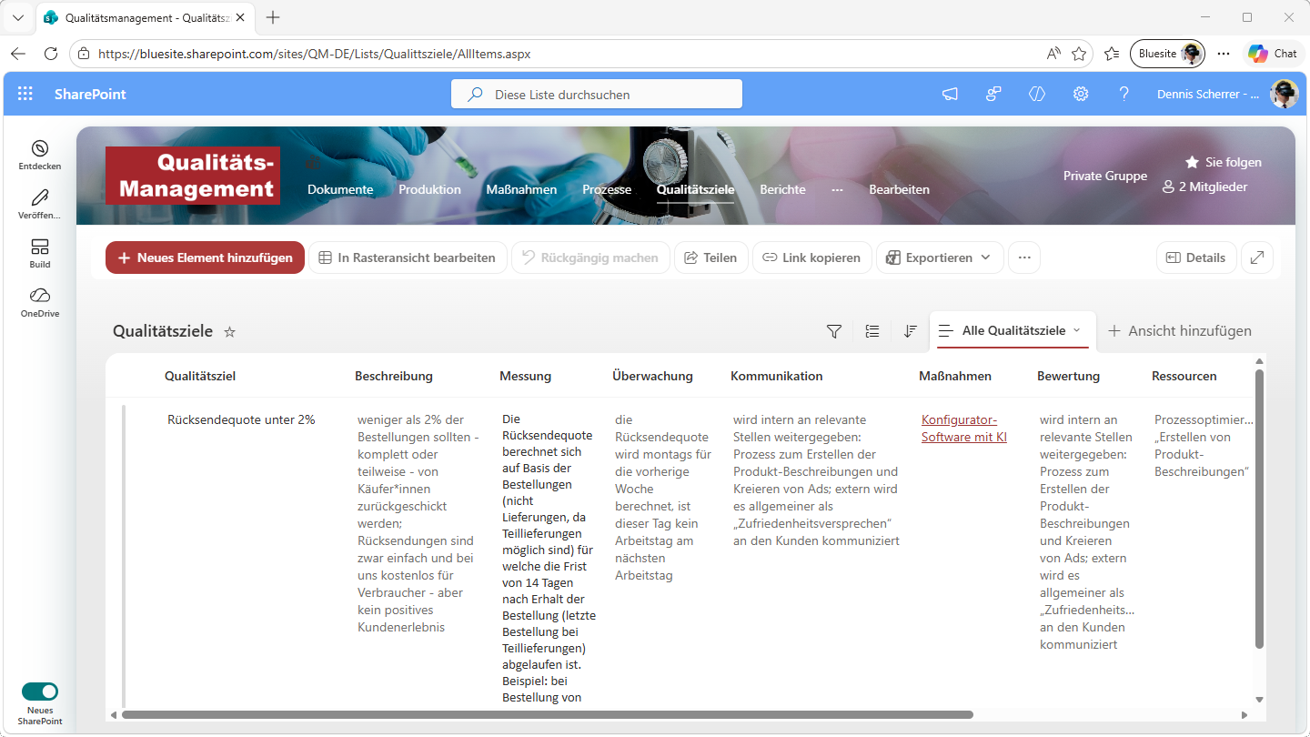 Entdecken Sie die SharePoint-Teamwebsite für Qualitätsmanagement von Bluesite IT-Beratung –